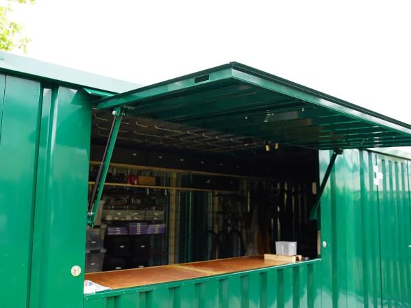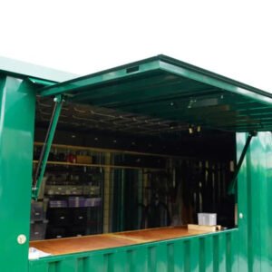 El contenedor de barra verde mide aproximadamente 3×2 metros y tiene un dosel plegable, las dimensiones son aproximadamente las mismas que las de un contenedor plegable de 10 pies. Esto es ideal para las personas que esperan que se seque y hace que el recipiente parezca una barra real. La marquesina también se puede cerrar con llave, por lo que el contenedor de bar se puede dejar con las pertenencias dentro de forma segura. Además, hay una puerta doble en el lado pequeño que permite introducir objetos voluminosos como un barril de cerveza. Por tanto, es la solución ideal para ofrecer un bar durante los eventos. Un contenedor de bar sencillo pero resistente en un color elegante y limpio como el verde, RAL 6016.