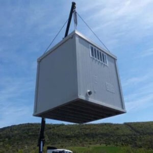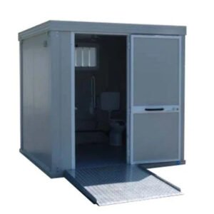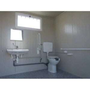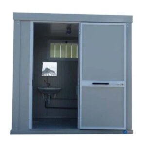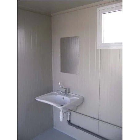 Nuestro módulo sanitario PMR incluye un lavabo PMR y un WC PMR, con una ventana basculante. Está equipado con un suelo reforzado de madera-cemento.
