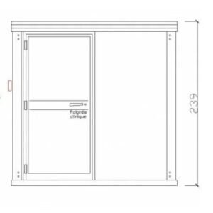 • Puerta: 1 puerta de hoja completa de 104 x 220 cm (90 cm de paso útil) con cerradura de condena (sin llave), manilla clínica de aluminio y barra de apoyo.